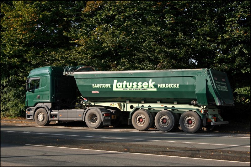 Scania R480 des Baustofftransportunternehmen Latussek aus Herdecke steht am 03.10.2008 bei Hagen auf dem Seitenstreifen aus einer anderen Ansicht.