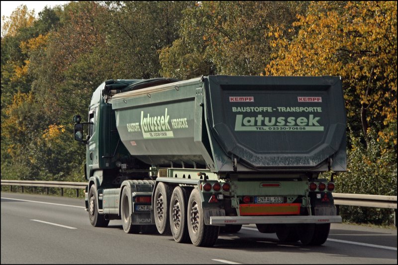 SCANIA R500 von Baustofftransporte LATUSSEK ist bei Schwerte-Ergste in Richtung Hagen unterwegs. Aufgenommen als Beifahrer...(13.10.2008)
