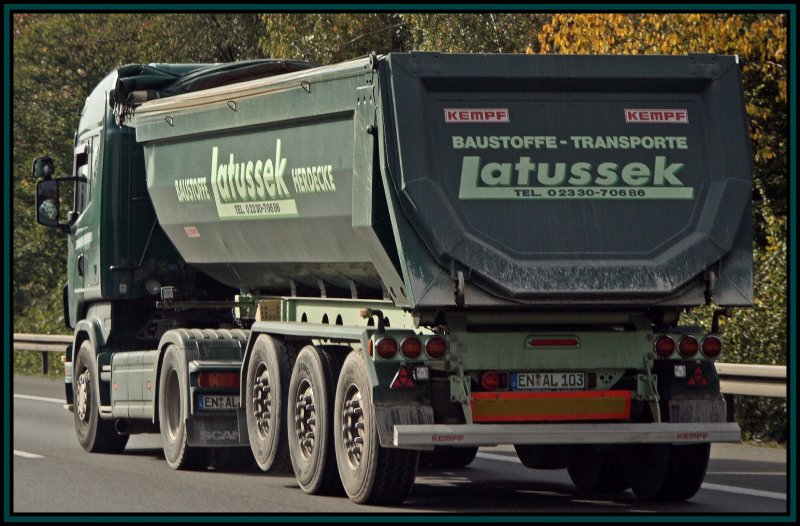 SCANIA R500 von Baustofftransporte LATUSSEK ist bei Schwerte-Ergste in Richtung Hagen unterwegs. (13.10.2008)