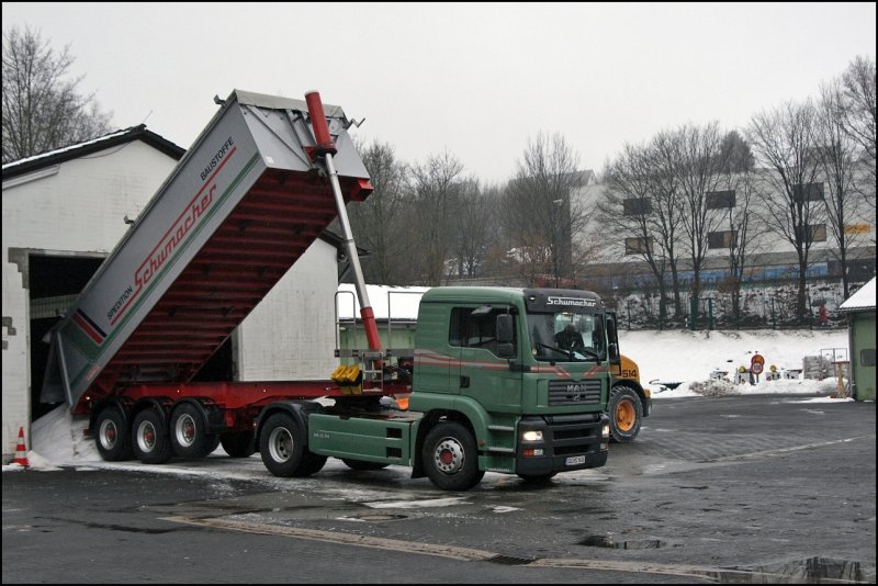 Die Salzvorräte werden ergänzt Nr.3: Ein MAN 18.430 D20 CommonRail der Spedition Schumacher kippt aus einem Langendorf Kippauflieger das Streusalz in die Salzhalle der AM Lüdenscheid. Das Wetter ist wieder "typisch" sauerländisch;-) (17.02.2009)