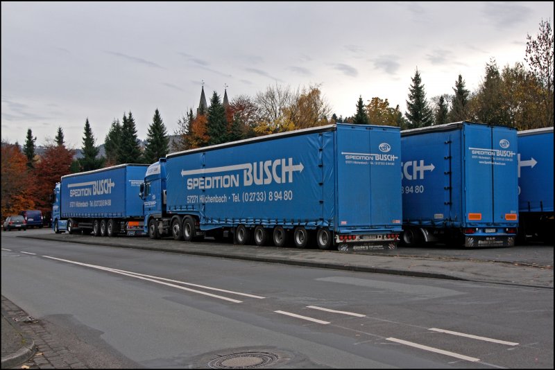 Blick von der Straße auf das Firmengelände der Spedition BUSCH. Obwohl kein Zaun vorhanden ist, bleiben die Fahrzeuge unangetastet!! Was in der heutigen Zeit recht selten ist! Im Bild unteranderem ein DAF XF105.510.