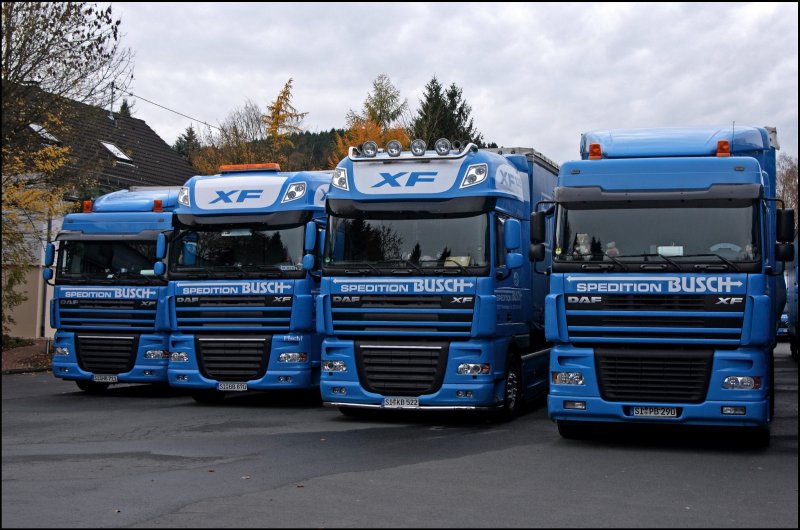 Fuhrpark-Impression der Spedition BUSCH: (v.l.n.r.) DAF XF95.480(?), DAF XF105.510, DAF XF105.510, DAF XF95.480(?).