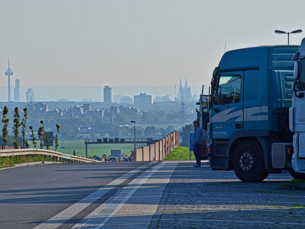 Schönes Wochenende. Wer als LKW Fahrer keine Ausnahme vom Sonntagsfahrverbot hat, hängt Samstags ab 15 Uhr bis Sonntag Abend 20 Uhr wie hier auf der A4 am Rasthof Frechen fest. Da kann man nur versuchen die Zeit rumzukriegen und denn schönen Blick auf Köln zu geniesen.