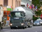 Scania R400 mit Siloauflieger am 19.10.2010 im strömenden Regen auf der A4 bei Aachen Richtung Niederländische Grenze unterwegs.