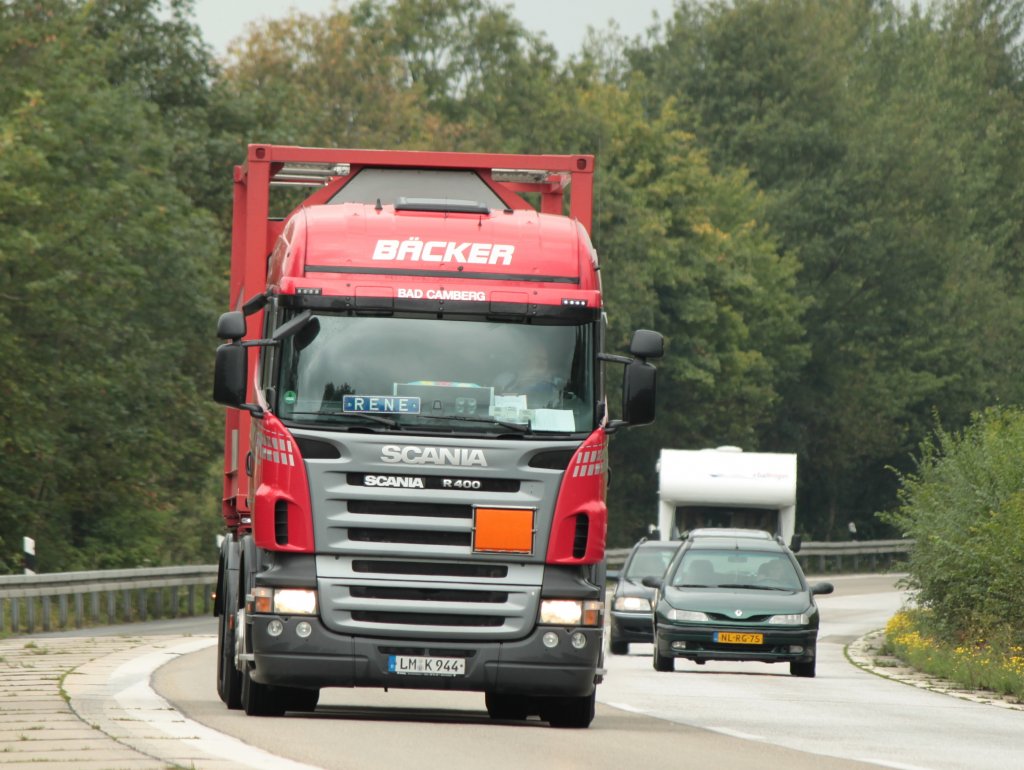 Scania R400 mit Containerauflieger am 12.08.2011 auf der A4 kurz hinter der Niederländischen Grenze.
