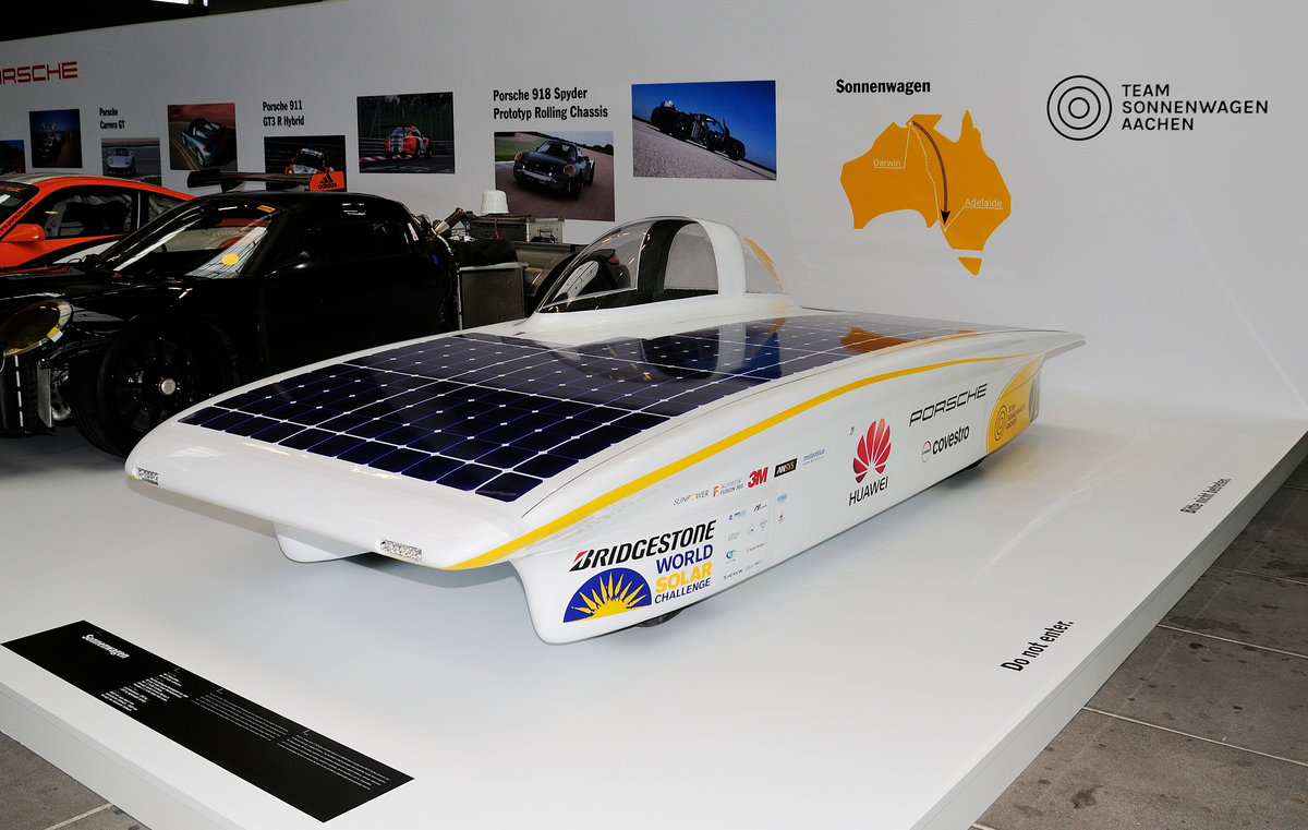 Huawei Sonnenwagens, Solarfahrzeug des Studenten-Verein "Team - Sonnenwagen Aachen" (RWTH Aachen). Es ist Teilnehmer beim "Bridgestone World Solar Challenge" Rennen für Solarfahrzeuge: Ausgestellt im Ringwerk Nürburgring beim 6h WEC Nürburgring 2017,