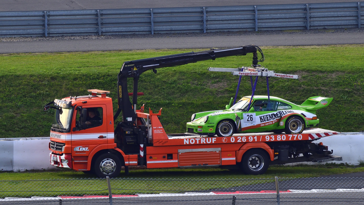 Porsche 911 RSR,Fahrer: Georg & Björn Griesemann, nach kleiner Panne auf einem Mercedes Abschleppwagen beim ADAC 1000Km Rennen am 17.Sep.2021 auf dem Nürburgring