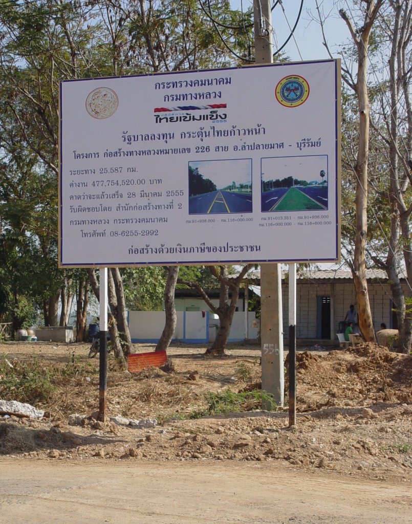 Dies Schild steht seit einiger Zeit in Lamplaimat im Nordosten Thailands und erläutert den Ausbau der Straßenverbindung zwischen Buri Ram, der Provinzhauptstadt und Lamplaimat von bisher 2 Fahrspuren auf 4 Fahrspuren