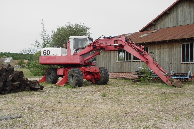 Dieser Radbagger, Typ 60P der Marke POCLAIN, gehört der Museumseisenbahn TRANSVAP, abgestellt am Bahnhof der TRANSVAP. Der Bagger ist Baujahr 1980 und hat 70 PS