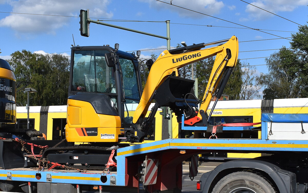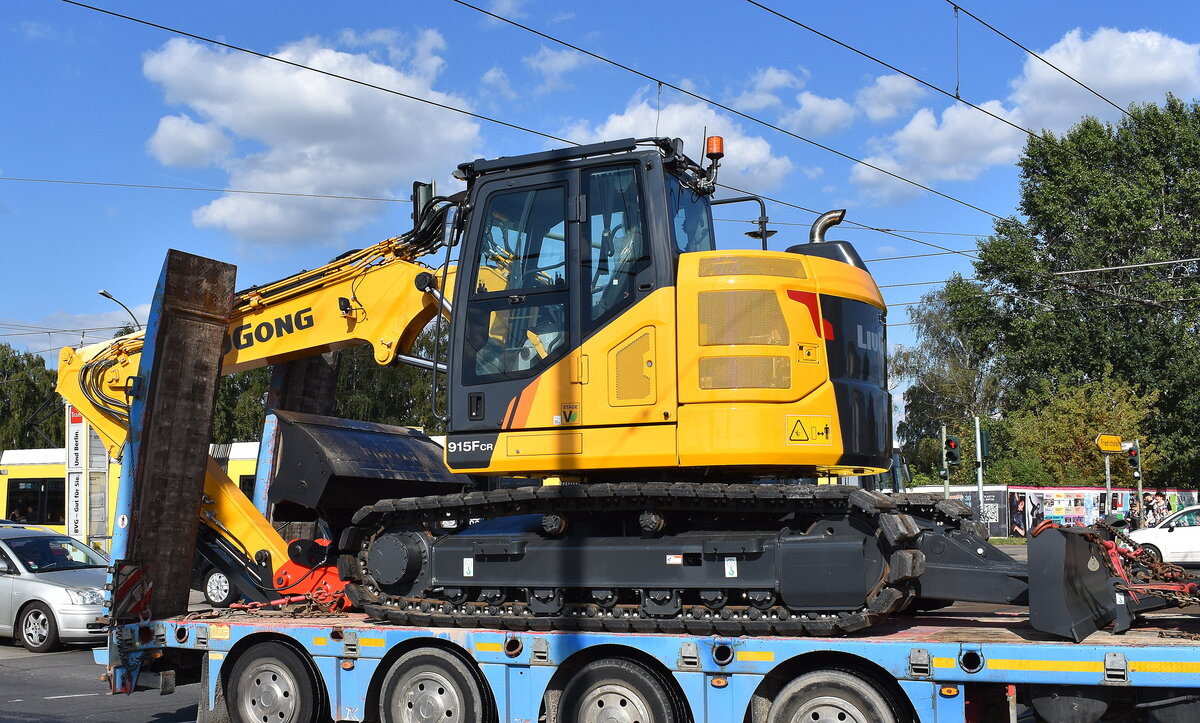 Chinesischen Hersteller Guangxi LiuGong Machinery Co., Ltd. mit einem Raupenbagger Typ 915 FCR auf einer Tiefladebrücke der Firmengruppe Hoffmann am 15.09.23 Berlin Marzahn.