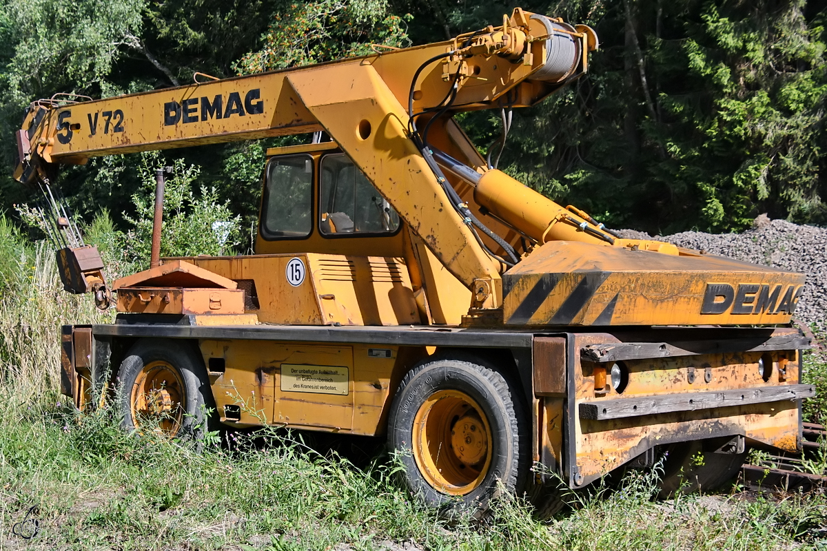 Dieser Demag V72 Autokran stand im satten Grün. (Hüinghausen, Juli 2022)