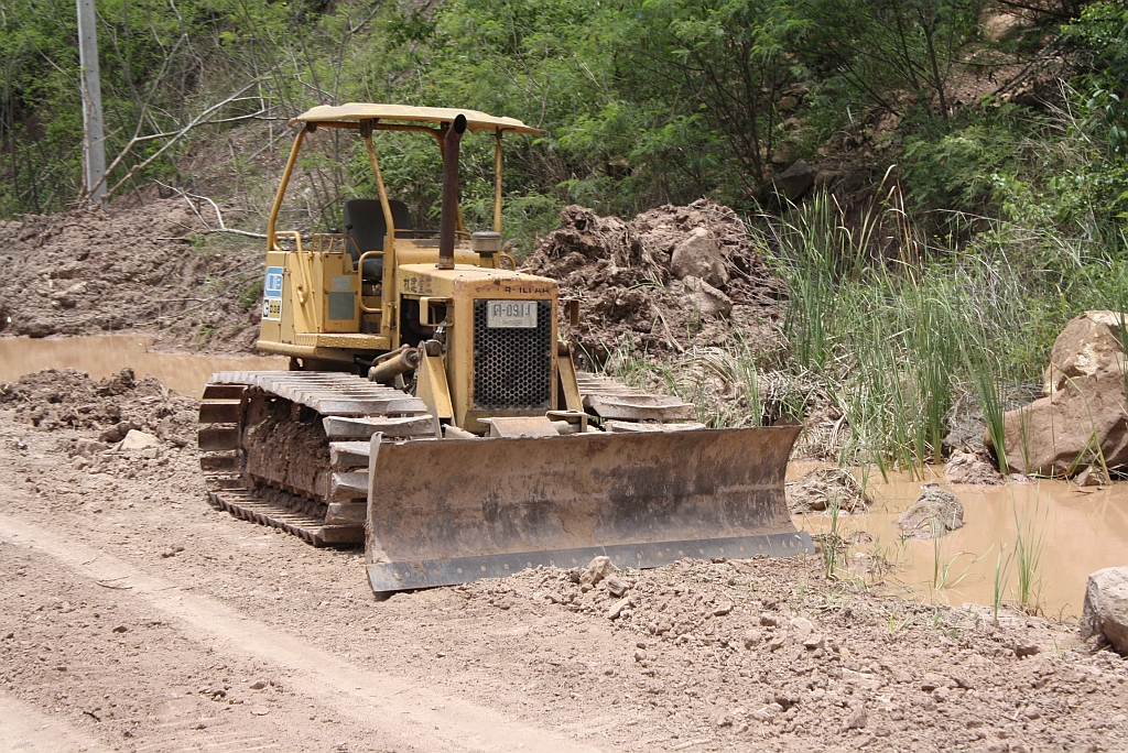 Planierraupe "Caterpillar D3B" gesehen am 13. Juni 2011 neben der Bahnstrecke zwischen den Bahnhöfen Chan Tuk und Khlong Khanan Chit.