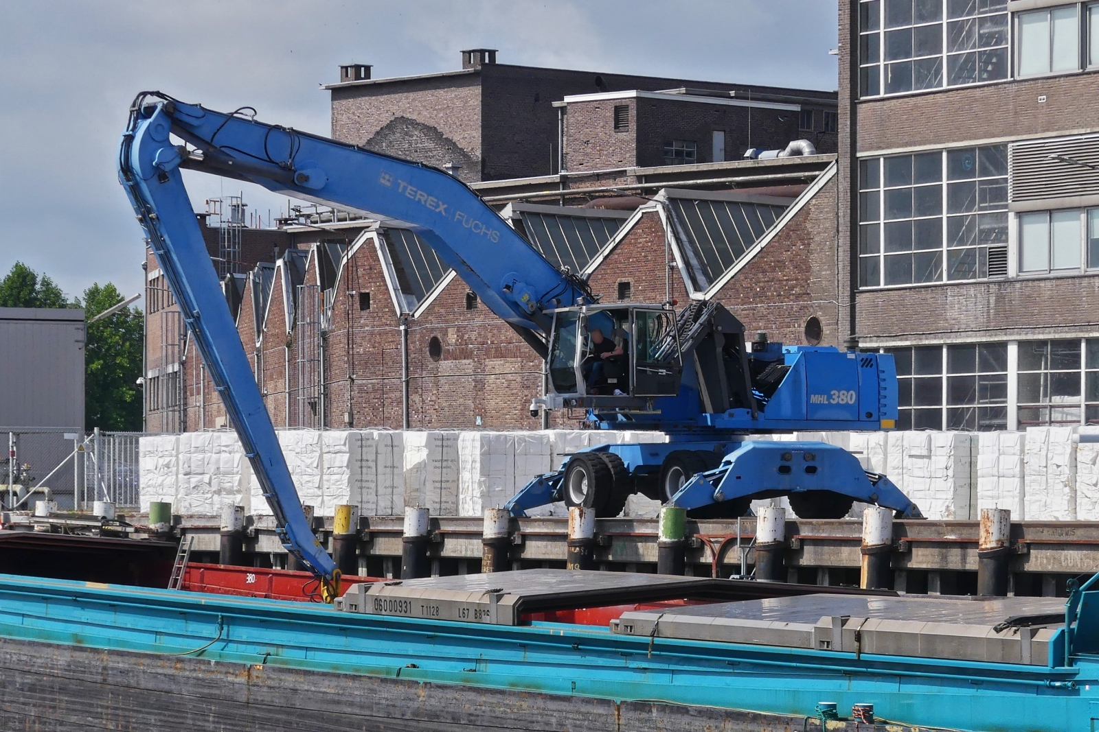 Terex-Fuchs Radlader, aufgenommen beim Entladen eines Frachters im Hafen von Maastricht. 07.2024