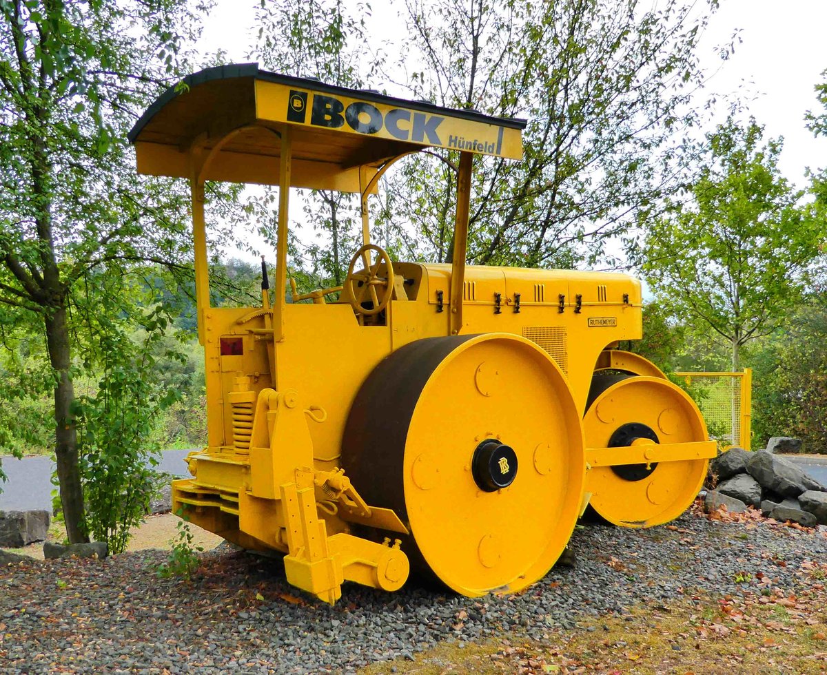 =Ruthemeyer-Dreiradwalze steht als Blickfang vor dem Betriebshof der Firma BOCK in Hünfeld, 09-2018