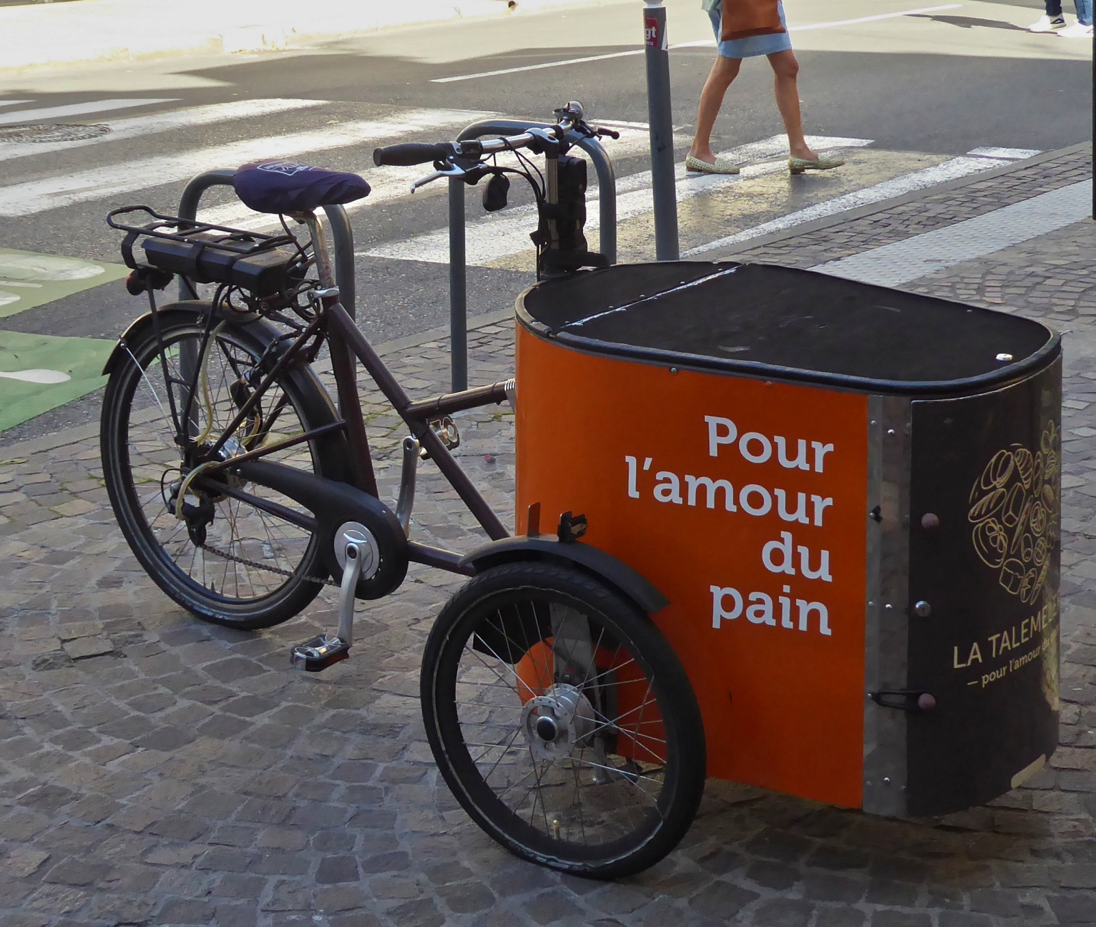 Lastenfahrrad eines Bäckerei Betriebes, steht nahe dem Laden auf dem Bürgersteig in Chambery. 09.2022