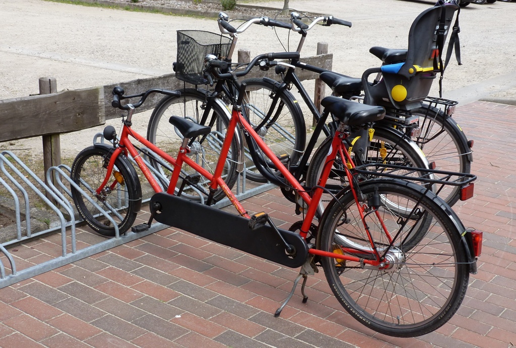 Tandemrad für die Nutzung Kleinkind Erwachsener in rot auf Amrum abgestellt 15.05.2015