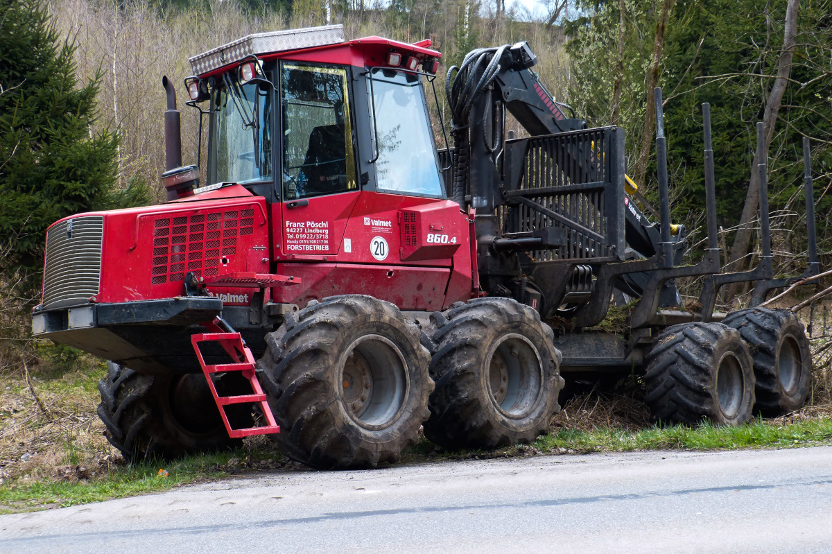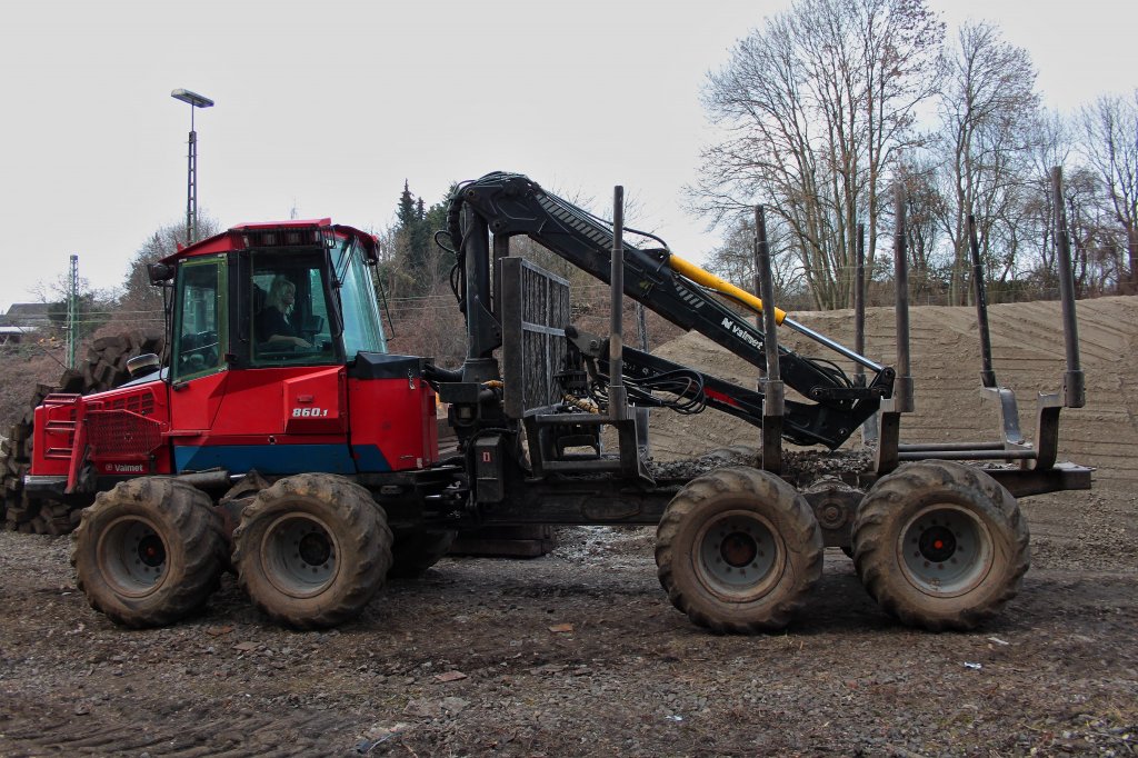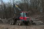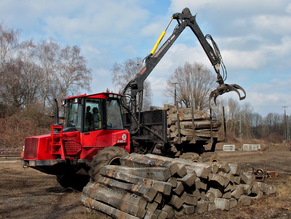Am Eilendorfer Bahnhof kommt am 06.03.2012 Valmet 840.3 Forstrückeschlepper auf einer Baustelle der DB mit ausgebauten Holzschwellen um sie zu einem Sammelplatz zu bringen, wo sie auf Waggons verladen werden.