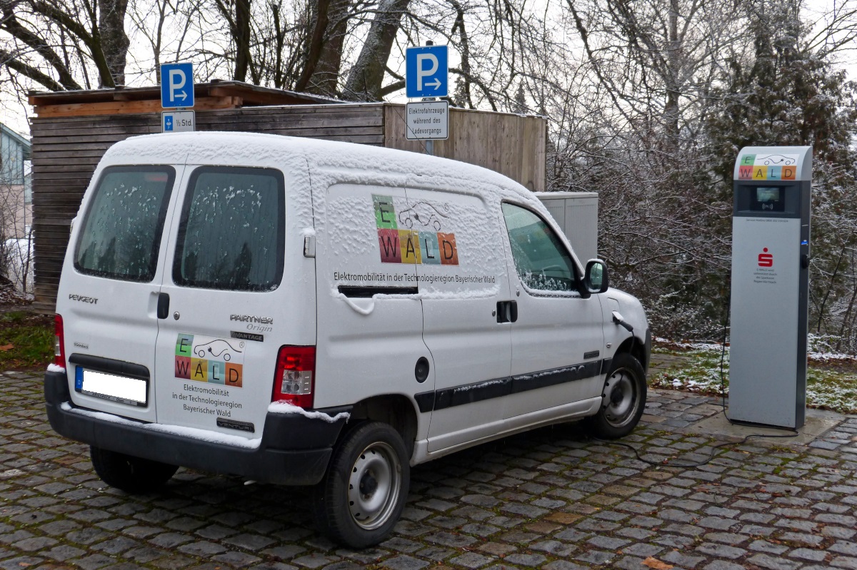 Rückansicht eines Peugot Partner mit Elektroantrieb (Hybrid?) an einer Ladestation in Regen 22.11.2015