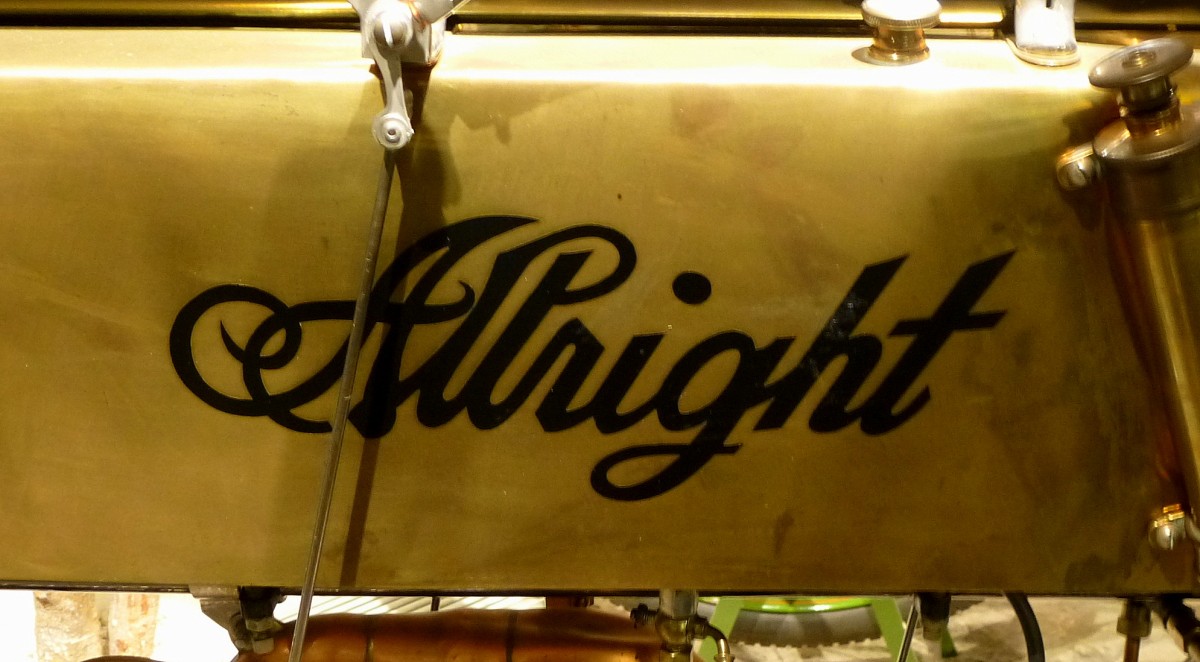 Allright, Tankaufschrift an einem Oldtimer-Motorrad von 1903, gebaut von der Lindenthaler Metallwerke AG, die Firma in Köln produzierte von 1901-39, Dez.2014 Köln