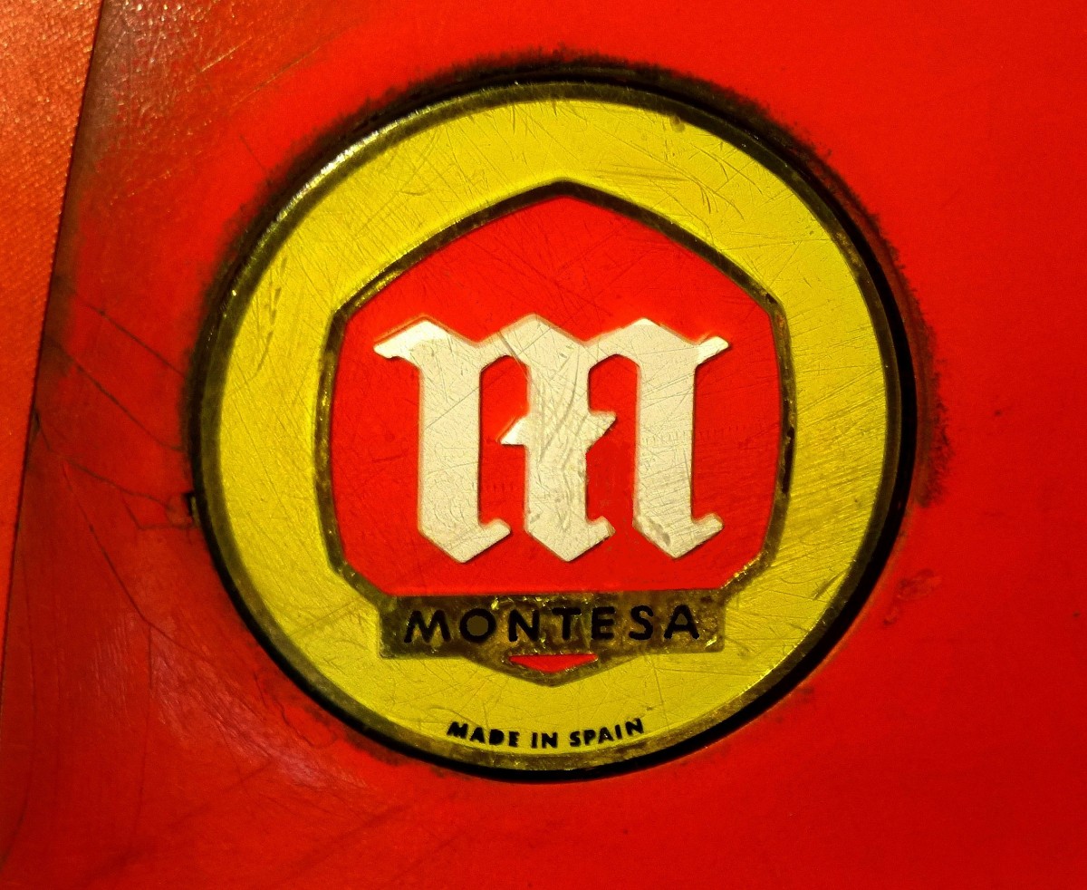 Montesa, Firmenlogo am Tank eines Oldtimer-Motorrades von 1977, die spanische Firma in Barcelona wurde 1945 gegründet und 1982 von Honda übernommen, Jan.2015