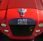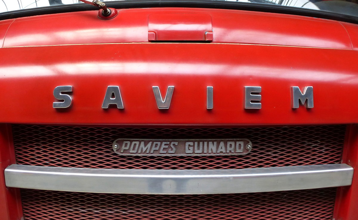 SAVIEM, Schriftzug an der Front eines Oldtimer-Feuerwehrautos von 1964, der französische Nutzfahrzeughersteller gehört seit 1979 zu Renault, Juni 2016