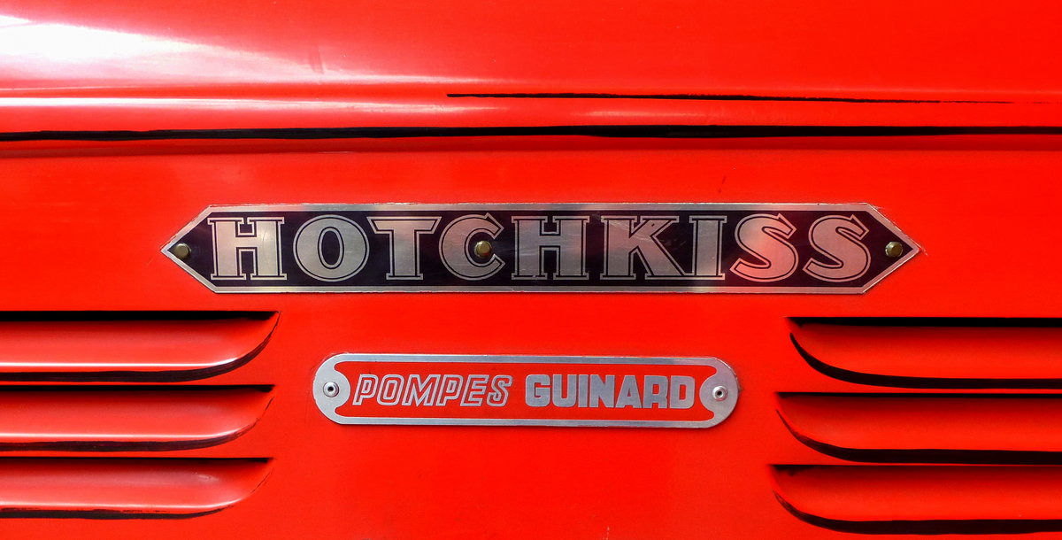 HOTCHKISS, Schriftzug links und rechts an der Motorhaube einer Oldtimer-Feuerwehr von 1960, Juni 2016