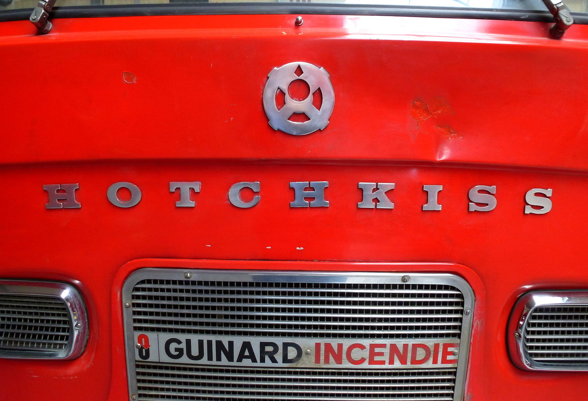 HOTCHKISS, Schriftzug und Logo an der Front einer Oldtimer-Feuerwehr von 1968, Juni 2016