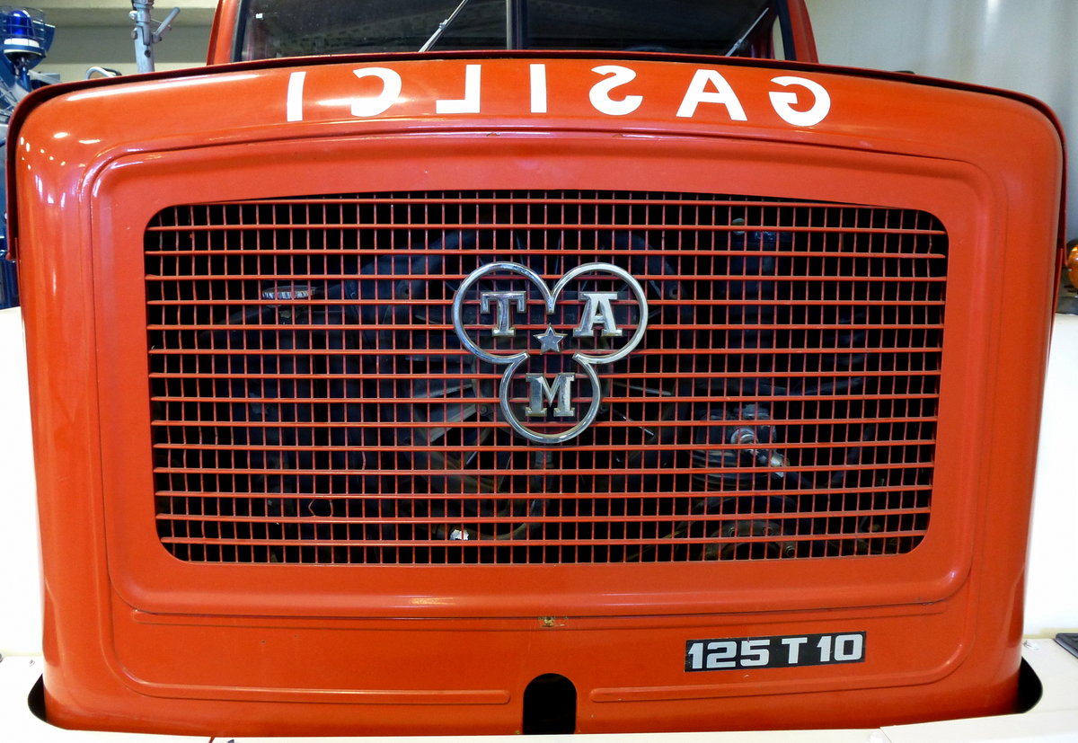 TAM, Nutzfahrzeugfirma aus Slowenien, Kühlerfront mit Logo an einer Oldtimer-Feuerwehr von 1970 (Lizenzbau Magirus-Deutz), Juli 2016