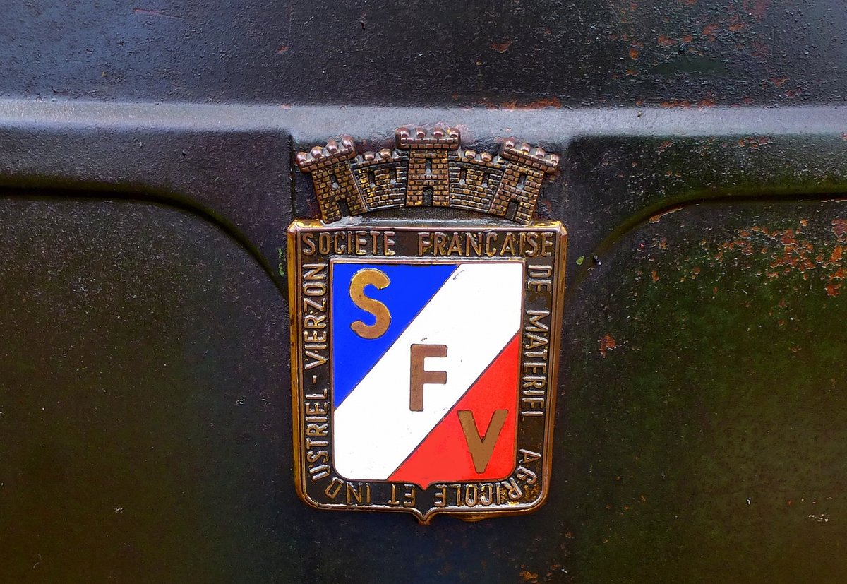SFV Vierzon, Logo an einem Oldtimer-Traktor von 1954, die 1878 gegründete Fabrik in Frankreich bestand bis 1964, Nov.2016