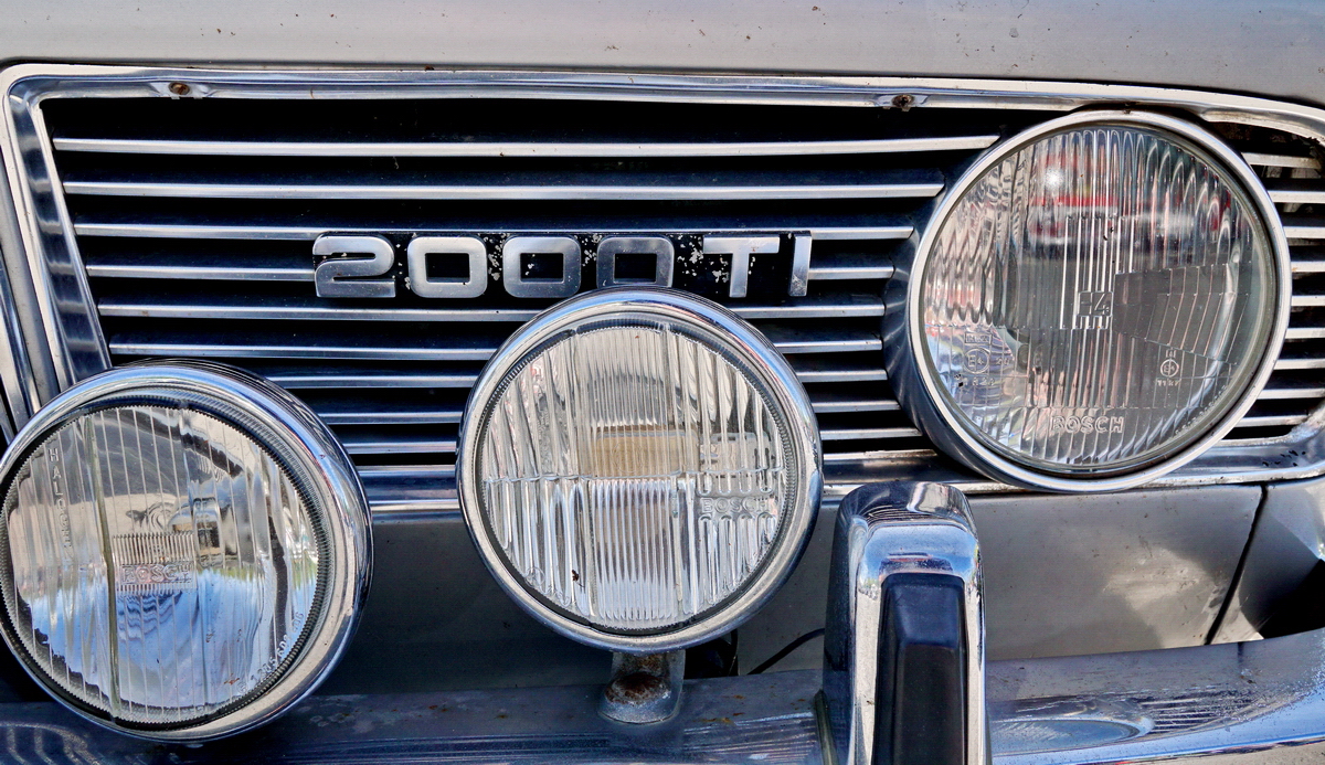Typenbezeichnung auf dem Kühlergrill eines BMW 2000TI. Baujahr um 1966. Foto:32. Oldtimertage Berlin-Brandenburg; 13.05.2019