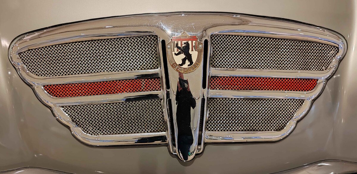 =Kühlergrill des Goliath GP 700 Sport, Bj. 1952, 845 ccm, 29 PS, gesehen im Museum PROTOTYP in Hamburg, 09-2024