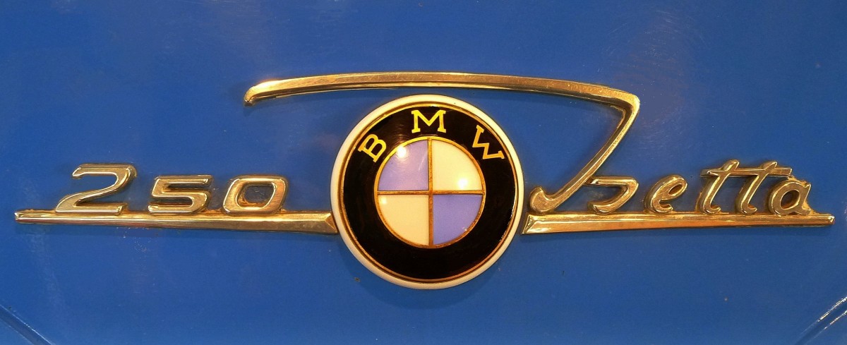 BMW Isetta, Aufschrift und Logo auf der Fronttür des Rollermobils("Knutschkugel"), wurde von 1955-62 gebaut, Feb.2014