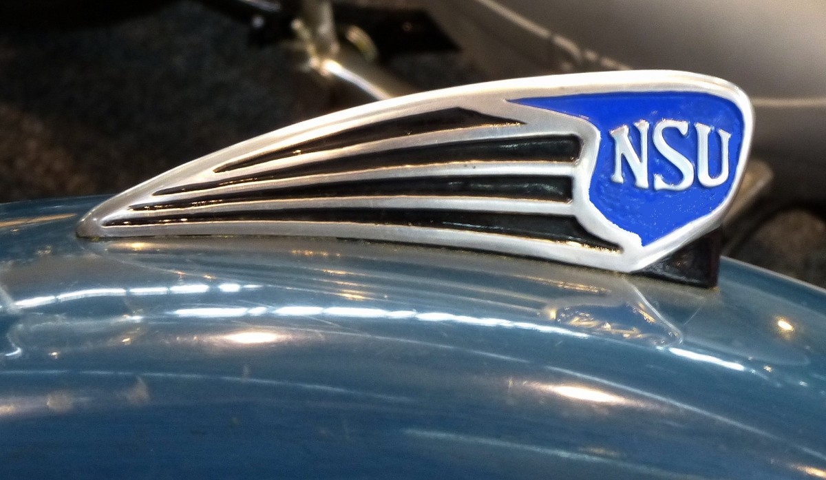 NSU, Firmenschild auf dem Vorderradschutzblech eines Oldtimer-Motorrades, Feb.2014