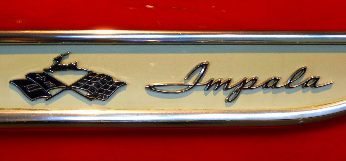 Chevrolet Impala, die US-amerikanische Limousine Baujahr 1961 hatte links und rechts an den Heckseiten dieses Logo mit Schriftzug, März 2014
