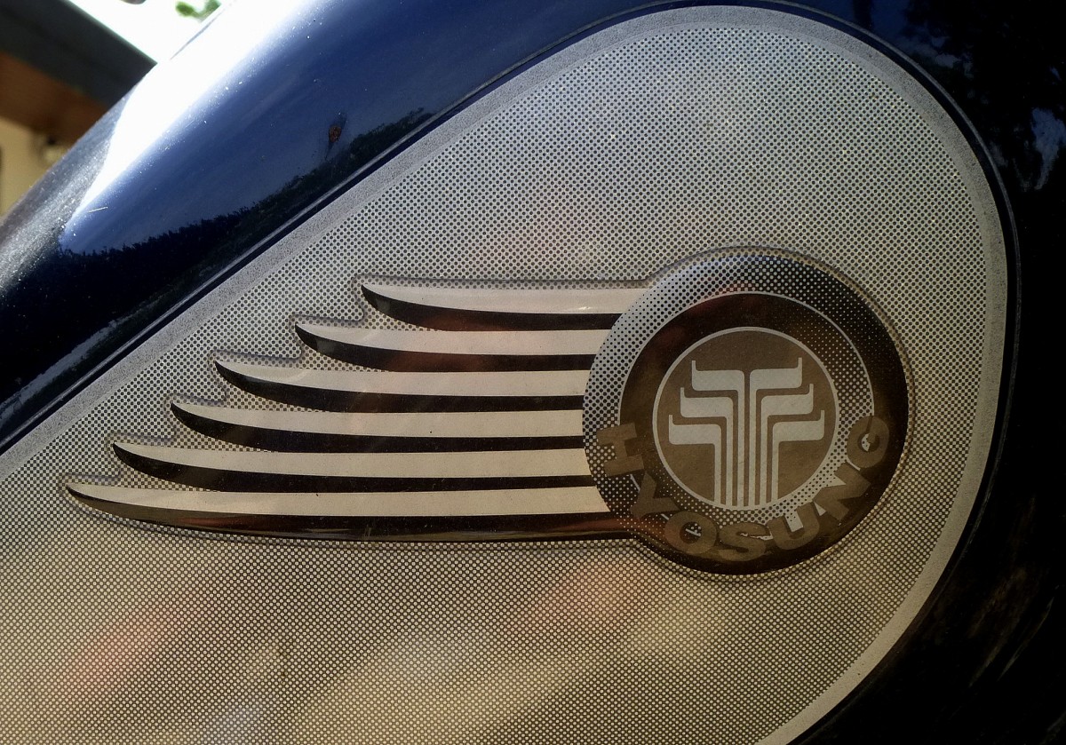 HYOSUNG, Tankemblem an einem Motorrad des Mischkonzerns aus Südkorea, Juli 2014