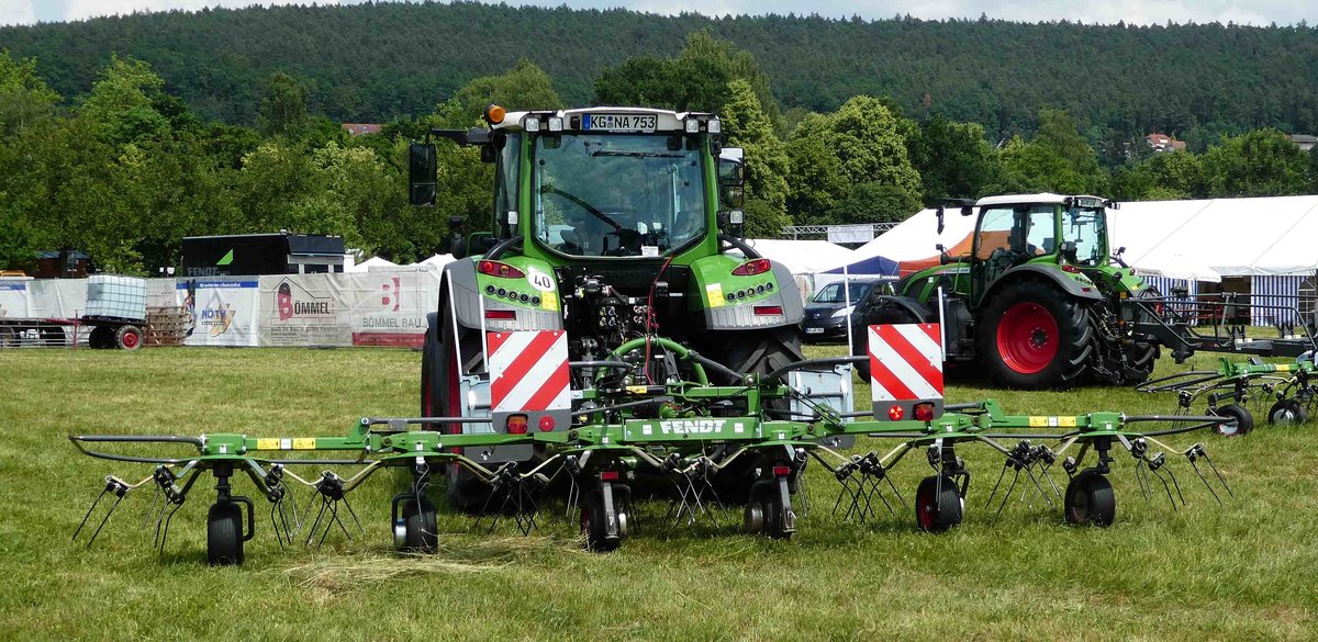 =Fendt 313 Vario mit Fendt-Twister 6606 DN, gesehen auf dem Ausstellungsgelände der Fendt-Freunde Bad Bocklet im Juni 2018