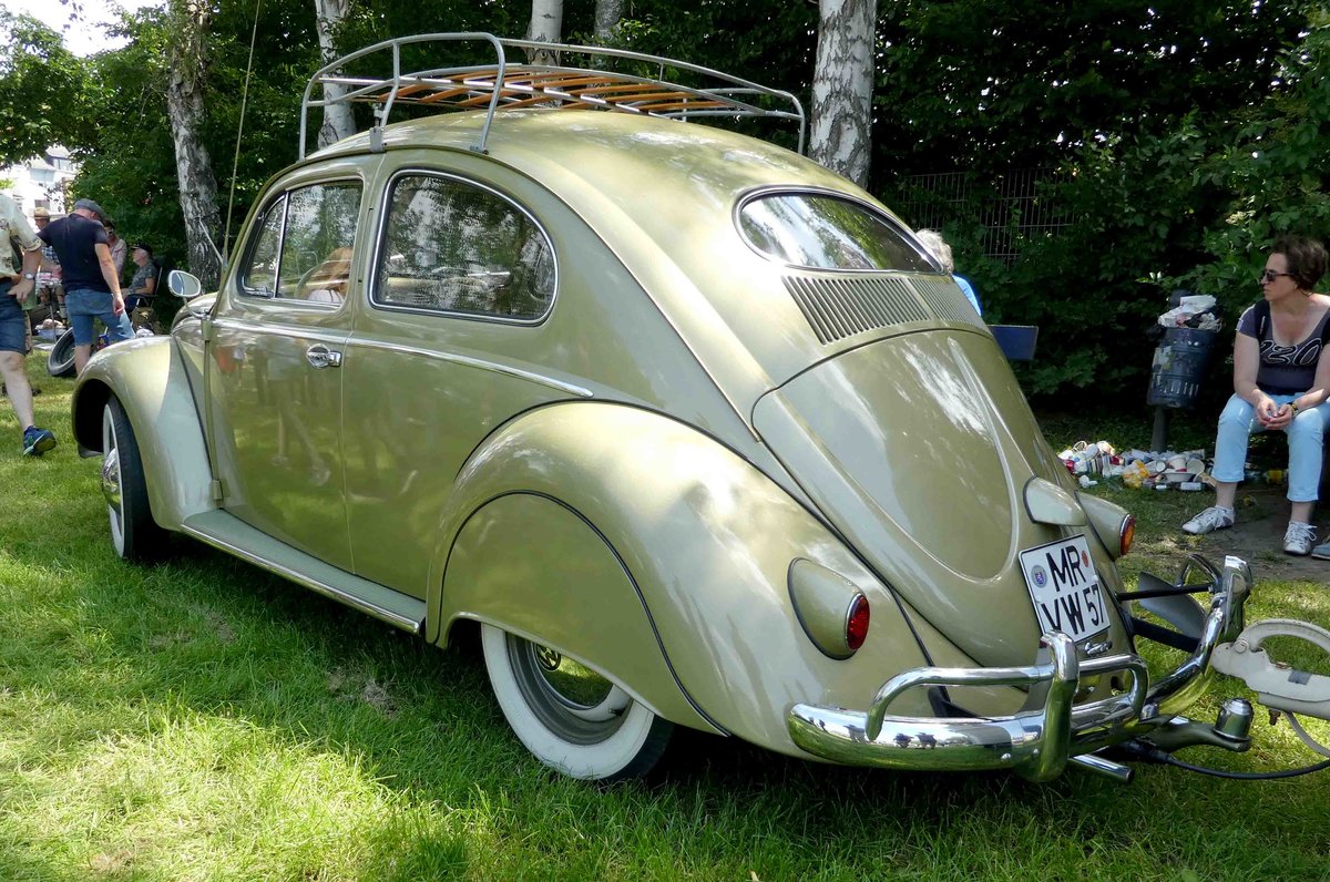 =VW Ovali-Käfer, hier mit zusätzlichen Hinterradabdeckungen, steht auf dem Ausstellungsgelände in Bad Camberg anl. LOTTERMANN-Bullitreffen im Juni 2019
