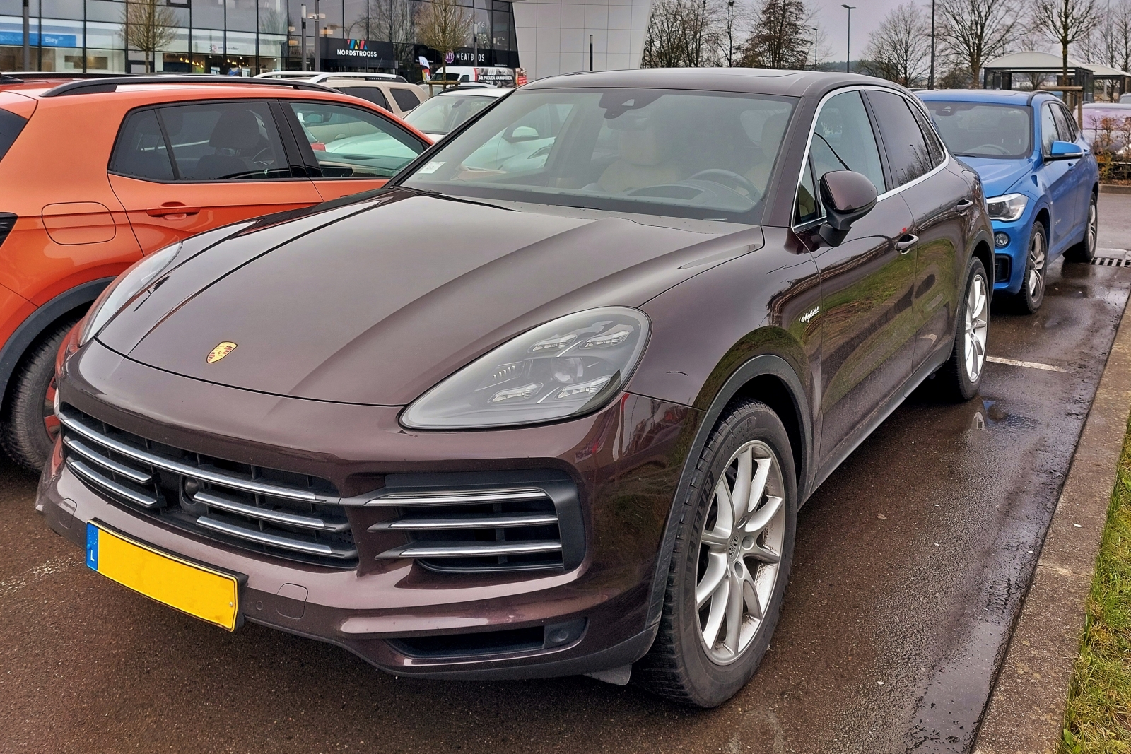 Porsche Cayenne eHybrid, gesehen auf einem Parkplatz eines Einkaufzentrums.