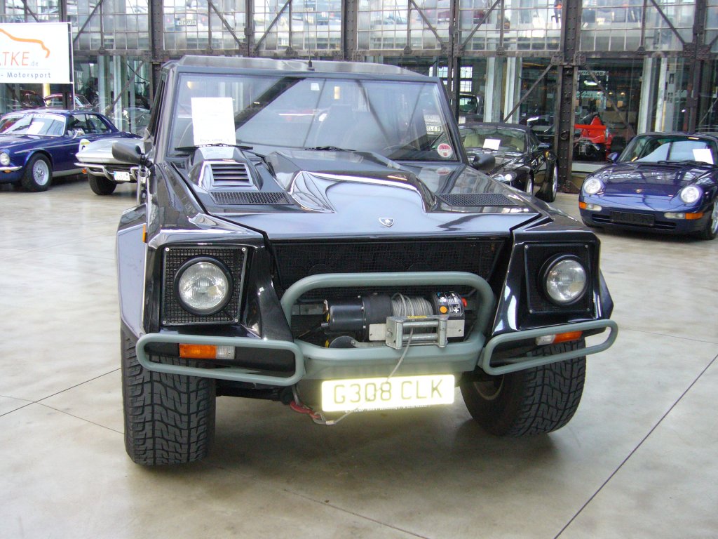 Einer von 301 produzierten Lamborghini LM002. Dieser SUV wurde von 1986 - 1993 produziert. Der V12-motor hat einen Hubraum von 5167 cm³ und leistet 455 PS. Laut zeitgenössischen Testberichten kann der LM002 bei forscher Fahrweise schon mal 40 Liter auf 100 km verbrauchen. Classic Remise Düsseldorf am 26.02.2017.