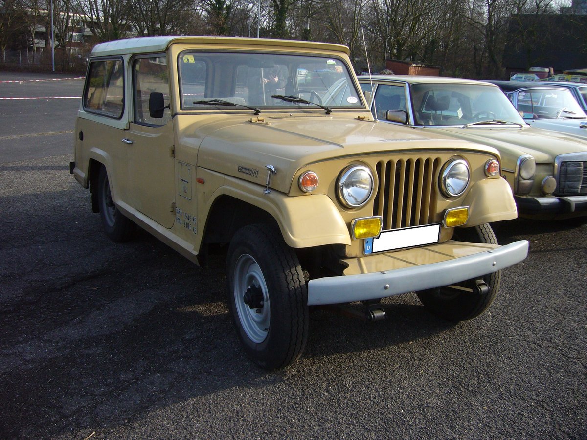 Willys Jeep Jeepster Commando HD, gebaut von 1967 bis 1973. Bei diesem Modell handelt es sich um einen Jeep mit einem längeren Radstand (256,5 cm). Angetrieben wird dieses "Arbeitstier" von einem Vierzylinderreihendieselmotor mit einem Hubraum von 2.2l und einer Leistung von 88 PS. In Europa traf man dieses Modell hauptsächlich in Spanien und Portugal an. Oldtimertreffen an Mo´s Bikertreff in Krefeld am 26.01.2020.