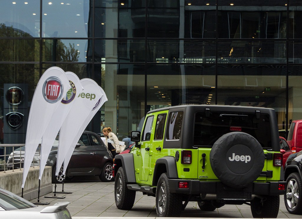 Jeep Wrangler steht vor dem Fiat Niederlassung Rhein-Main. Aufnahme: 23.10.2012