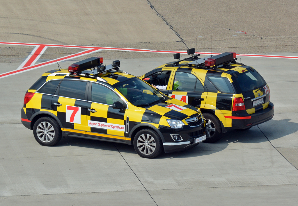 Plauderstündchen zwischen 2 Fahrern von Vorfeld-Kfz., Opel Antara und Kia Sorento, am Flughafen Düsseldorf - 04.09.2014