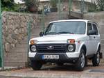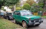 Lada Niva in der Frabe "Afalina Turquoise", fotografiert in Oktober, 2020.