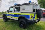 =Land Rover Defender in "Polizei-Look" steht auf dem Parkgelände der Rettmobil 2024 in Fulda.
