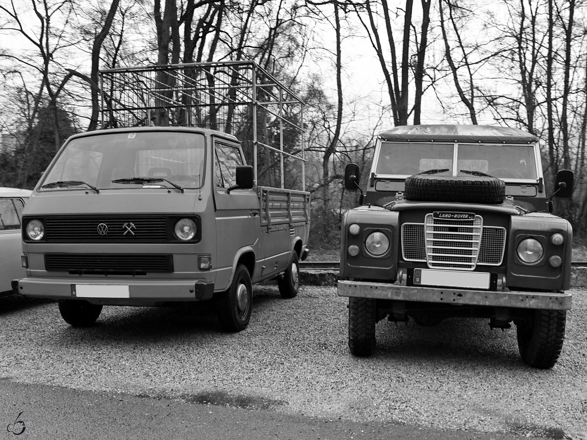 Ein VW Transporter und ein Land Rover auf einem Parkplatz in Witten. (April 2018)