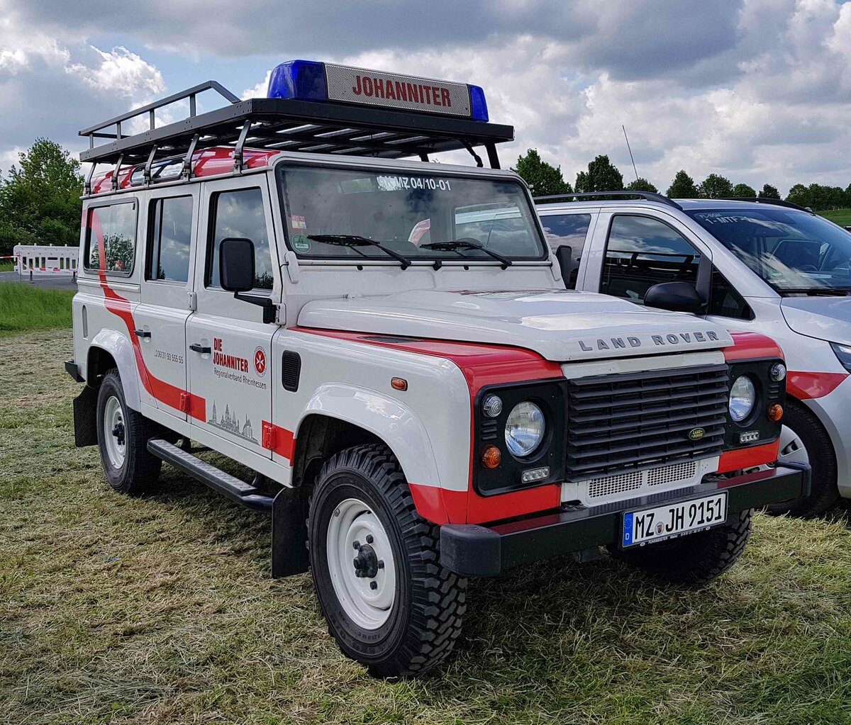=Land Rover als Einsatzfahrzeug der JOHANNITER vom Regionalverband RHEINHESSEN, steht auf dem Parkplatz der Rettmobil 2022, 05-2022