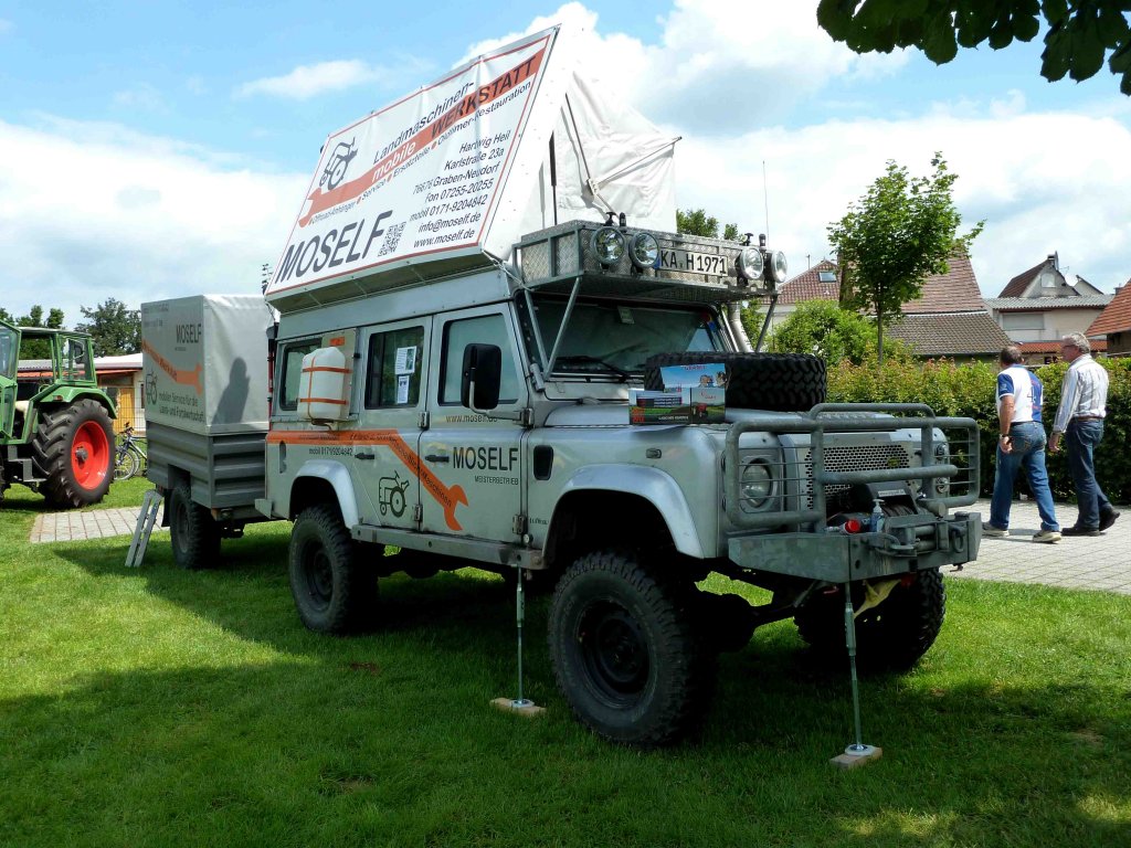 Land Rover mit Anhänger als mobile Werkstatt steht beim Sommerfest in Karlsdorf-Neuthart im Juni 2013