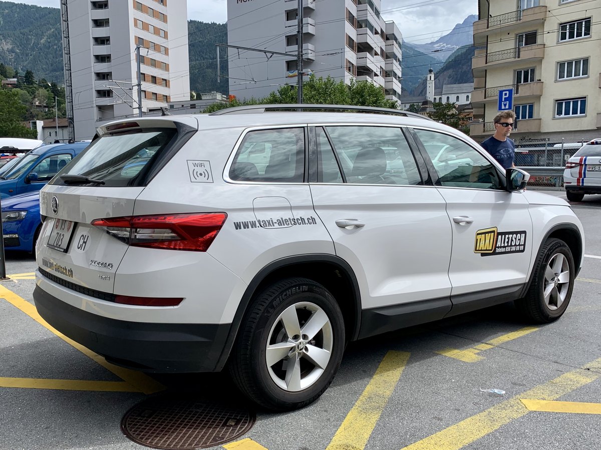Heckansicht des Škoda Kodiaq von Taxi Aletsch am 17.8.19 auf dem Bahnhofplatz Brig.
