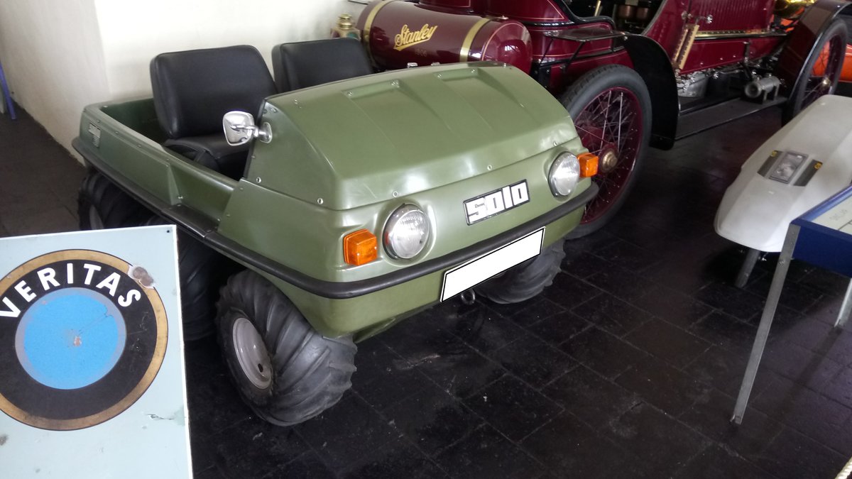 Solo 750. 1973 - 1980. Die Motorenfabrik Solo aus Sindelfingen fertigte dieses 6x6 Amphibienfahrzeug nur auf Bestellung. Es wurden ca. 100 Fahrzeuge produziert. Der Preis lag etwa bei DM 14000,00. Der 2-Zylinderzweitaktmotor hat einen Hubraum von 430 cm³ und leistet 20 PS. Auf der Straße erreicht dieser "Alleskönner" ca. 60 km/h und im Wasser 3 km/h. Automuseum Melle am 15.04.2017.