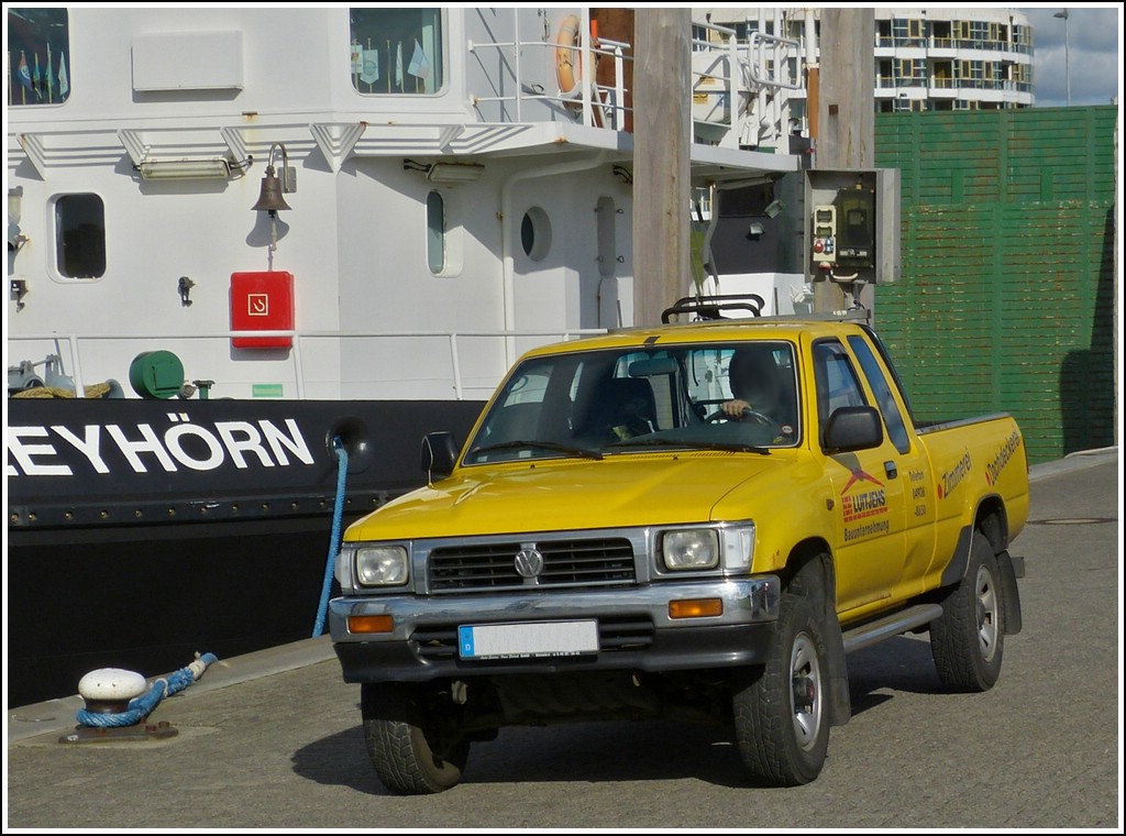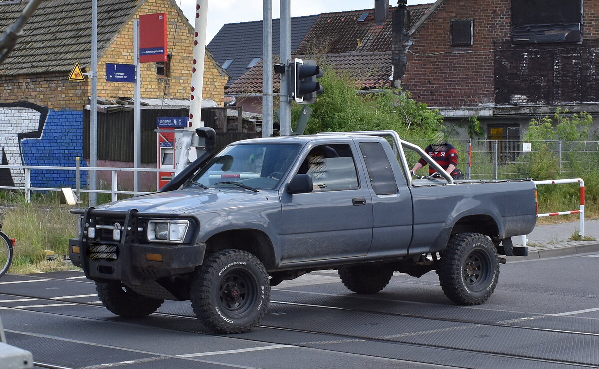 Modifiziertes VW-Pickup Modell Taro, höher gelegte Achsen, spez. Auspuff u.v.m. am 25.05.23 Bahnhof Lutherstadt Wittenberg-Piesteritz. Lt. WIKIPEIA ist der VW Taro ein Pick-up der Marke Volkswagen, der als Lizenzbau des Toyota Hilux der fünften Generation von 1989 bis 1995 im VW-Werk Hannover und von 1995 bis 1997 im Volkswagenwerk Emden gefertigt wurde.